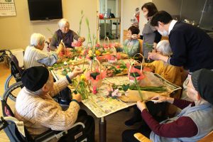 芳しい香りに包まれながら生ける皆さまの表情は、いつも以上に明るく、ピンクのグラデーションが美しい豪華な仕上がりに。「一足早く春が来たみたい」と会話も弾みます。五感で春を感じる、心華やぐひとときとなりました。