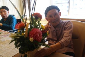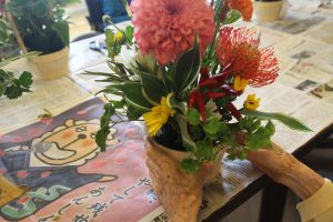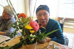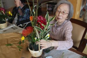 今月のお花サークルは秋の訪れを感じる花々で行いました。鮮やかな赤が映えるピンクッションに、やわらかなオレンジ色のケイトウ、香辛料でお馴染みのトウガラシなどのアレンジメントを楽しみました。スタッフがサポートしながら、一緒に「ここがいいかしら?」「これが真ん中でどう?」と、思い思いにお花を活けていただきました。「昔は秋になると、野にススキを取りに行ったのよ。」「このお花の色が秋らしくて素敵ね。」と和やかに会話が弾み、笑顔あふれる時間となりました。