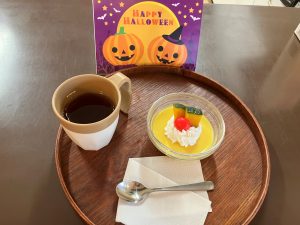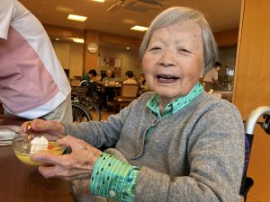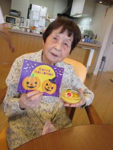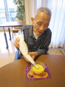 今月は、秋の味覚「かぼちゃ」を使ったプリンをご提供しました。ご入居者にはハロウィン仕様のトッピングで、デコレーションを楽しんでいただきました。 『どこに乗せようかな~。』と迷いながらホイップを絞ったり、かぼちゃを飾ったり、チェリーを最後にポンと乗せる瞬間には笑顔が広がり、ご自分だけの『かぼちゃプリン』が完成!『可愛くできたから食べるのに気が引ける。』『ホイップをたっぷりにしてみたわ。』など、皆様和気あいあいと笑顔いっぱい楽しんでおられました。