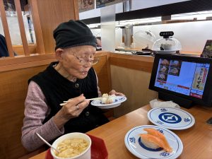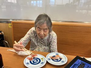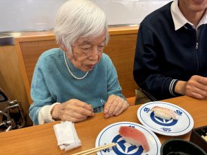 まぐろやサーモンなど、それぞれお気に入りのネタを召し上がり、締めにはデザートも堪能されていました。中には6皿ぺろりと召し上がる方もおられ、「もうお腹いっぱい!」と満面の笑みを浮かべておられました。「おいしかった」「また行きたいね」との声もたくさんいただき、スタッフにとっても嬉しいひとときとなりました。