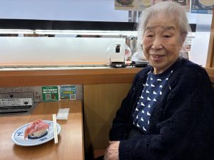 11月の外出イベントは、「くら寿司」へ出かけました。店内に入ると、お寿司が流れるレーンを眺めながら、「どれにしようかな」と楽しそうに選ばれる姿が印象的でした。