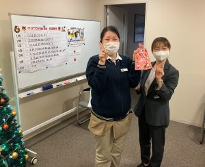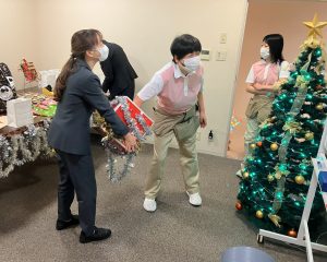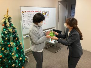 今年もスタッフへ感謝の気持ちを込めた「クリスマス抽選会」を開催しました。社長からの心温まるお菓子のプレゼントや、豪華景品が並び、しかも外れクジなし。会場では、一等賞を狙ってクジを引くスタッフの歓声や、落胆の声が入り混じり、大いに盛り上がりました。今年の一等賞は、有名ファストフード店で利用できるグルメカード。日頃の頑張りを労う、笑顔あふれるひとときとなりました。