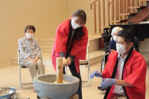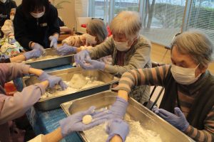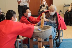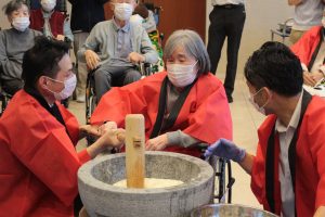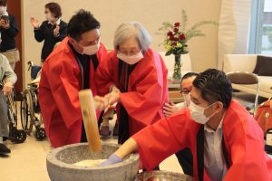 年末恒例の「お餅つき」を開催いたしました。ご入居者、スタッフが一緒になって臼と杵を囲み、「よいしょ!」の掛け声とともに、力強く杵を振る姿に、周りからは自然と大きな手拍子が沸き起こりました。つきたてのお餅はご入居者に一つひとつ丁寧に丸めていただきました。『昔はよく餅つきをしたのよ』『こうして季節の行事を楽しめるのが嬉しい』『いい年越しができそう』などお話しも弾み、自然と笑顔がこぼれていました。